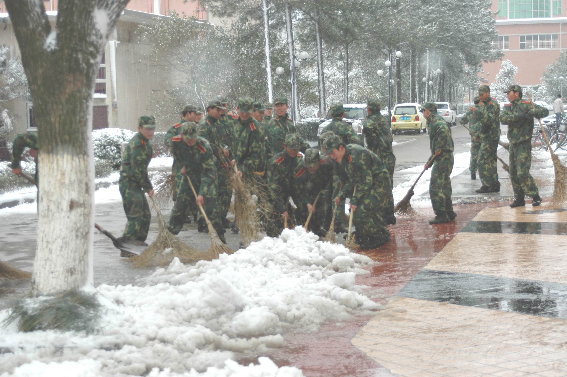3月13日,又一場春雪悄悄降臨,整個(gè)校園一片潔白。為了方便師生行走,我校國防生早晨6:50就在校園各條道路上清掃積雪。到發(fā)稿時(shí),他們還在忙碌。有個(gè)國防生說,他們的鞋子全濕透了,但一點(diǎn)都不覺得冷。他們臉上是一臉的笑容。