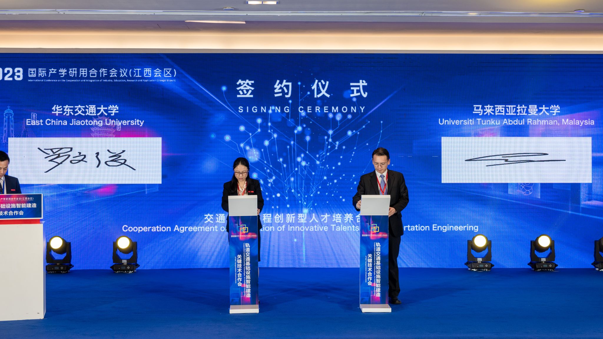 羅文俊與馬來西亞拉曼大學(xué)李光前理工學(xué)院電機(jī)與電子工程碩士系主任Shee Yu Gang簽署華東交通大學(xué)與馬來西亞拉曼大學(xué)交通運(yùn)輸工程創(chuàng)新型人才培養(yǎng)合作協(xié)議。