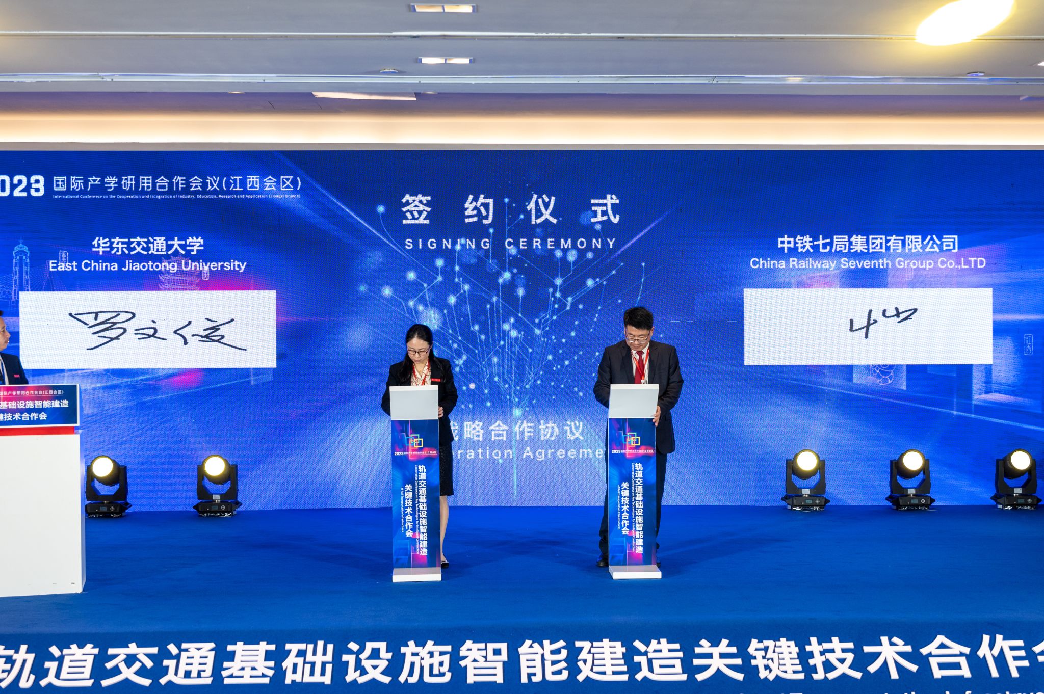 羅文俊與中鐵七局集團(tuán)有限公司黨委常委、總會計(jì)師、董事會秘書王愷簽署華東交通大學(xué)與中鐵七局有限公司戰(zhàn)略合作協(xié)議。