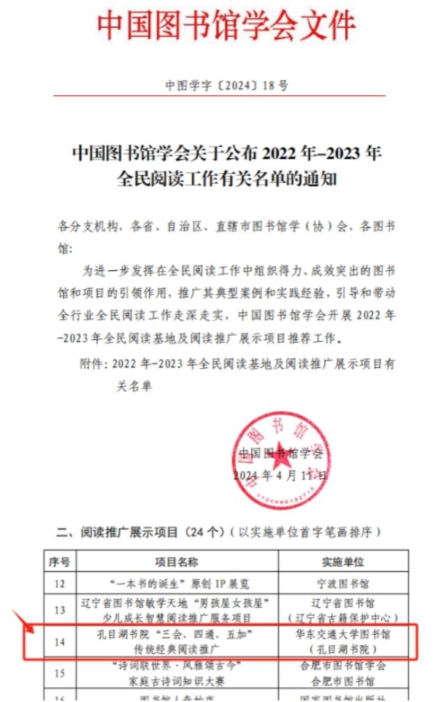 日前,中國(guó)圖書館學(xué)會(huì)發(fā)布《中國(guó)圖書館學(xué)會(huì)關(guān)于公布2022年-2023年全民閱讀工作有關(guān)名單的通知》。孔目湖書院申報(bào)的《孔目湖書院“三會(huì)、四通、五加”傳統(tǒng)經(jīng)典閱讀推廣》項(xiàng)目進(jìn)入中國(guó)圖書館學(xué)會(huì)“2022年-2023年閱讀推廣展示項(xiàng)目”名單。全國(guó)共24個(gè)項(xiàng)目入選該項(xiàng)目名單,其中高校僅8個(gè)項(xiàng)目入選。