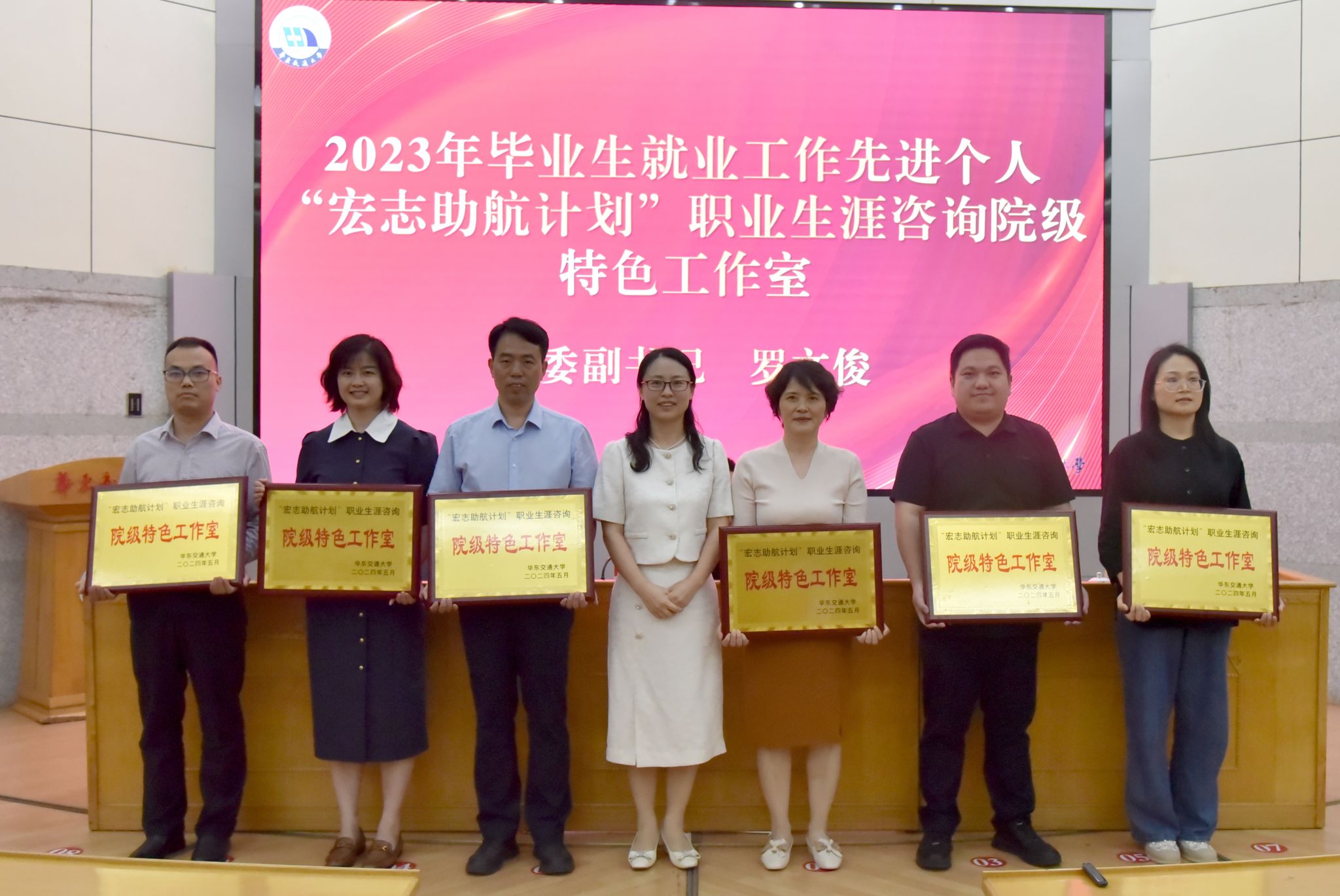 會上舉行了頒獎授牌儀式。徐長節為2023年招生宣傳優秀學院、畢業生就業工作優秀學院、特色就業專項獎頒獎。羅文俊為2023年畢業生就業工作先進個人頒獎,為“宏志助航計劃”職業生涯咨詢院級特色工作室授牌。