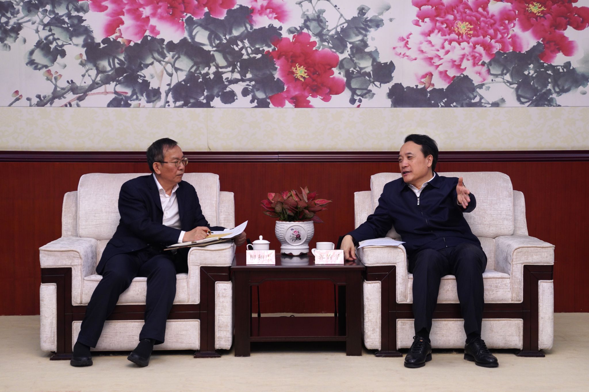 國鐵集團黨組書記、董事長郭竹學,黨組成員、副總經理王立新會見了柳和生一行。國鐵集團辦公廳主任張才春、科技與信息化部主任張大勇、黨組組織部(人事部)部長(主任)李東、勞動和衛生部主任林曉軍一同會見。
