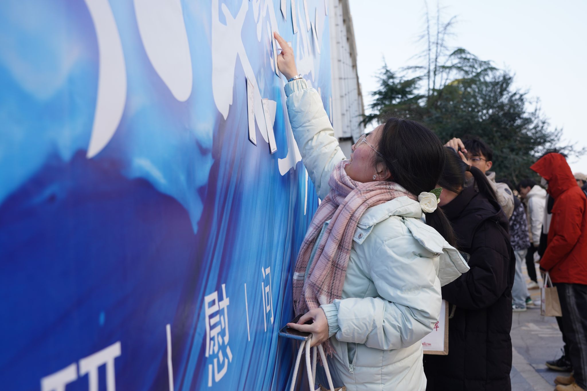 “全力以赴!加油!”“穩住心態、下筆如有神,我一定會上岸的!”……同學們紛紛將心愿寫在心愿卡上,或墊著腳尖,或一躍而起,努力將心愿卡貼到許愿墻的更高處,希冀愿望成真。
