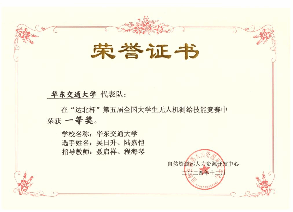 近日,“達北杯” 第五屆全國大學生無人機測繪技能競賽舉行。我校聶啟祥、程海琴老師指導的,2022級測繪工程專業學生吳日升和2022級鐵道工程專業學生陸嘉愷組成的隊伍勇奪大賽一等獎,排名位列全省本科院校參賽隊伍第一。