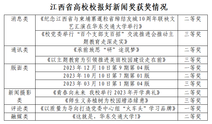 近日,江西省高校校報協會公布了“2023年江西省高校校報好新聞”評審結果,我校報送的11件作品獲一等獎2項、二等獎5項、三等獎4項。其中,獲評論類一等獎1項;版面類一、二、三等獎各1項,消息類二、三等獎各1項;通訊類二、三等獎各1項;新聞攝影類二、三等獎各1項;融媒類二等獎1項。