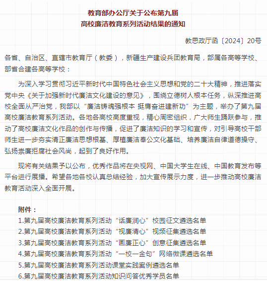 第九屆高校廉潔教育系列活動以“廉潔鑄魂強根本 挺膺奮進建新功”為主題,由教育部思想政治工作司主辦,本次活動分為“話廉潤心”校園征文、“視廉清心”視頻征集、“畫廉正心”創意征集、“一校一金句”網絡微課及課堂實踐案例5個系列,每個系列遴選優秀作品100件。