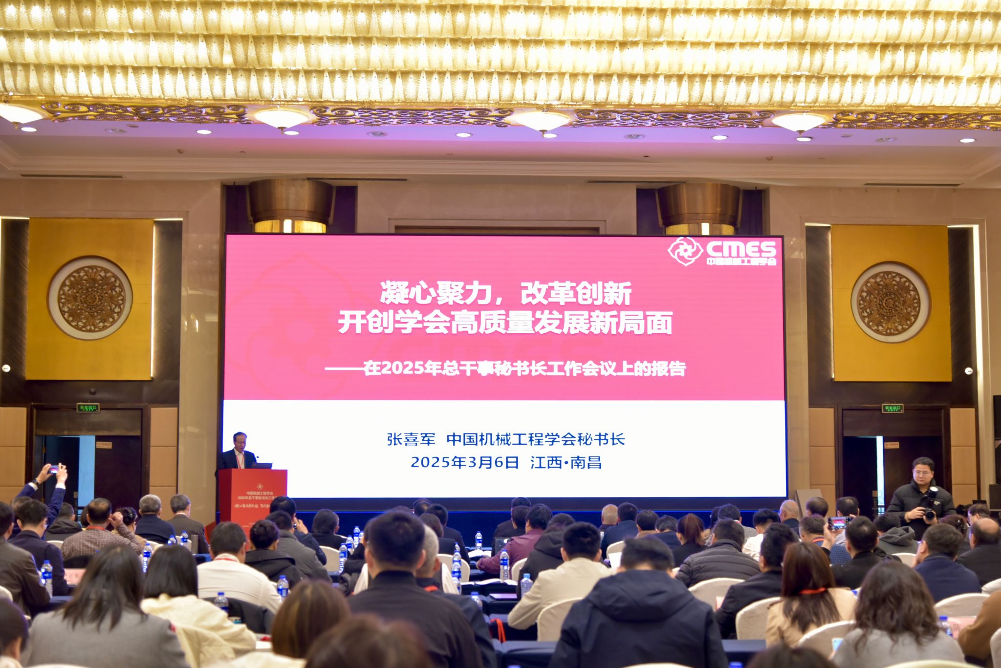中國機械工程學會黨總支書記、原副理事長陸大明,江西省機械工程學會榮譽理事長李立德,中國機械工程學會秘書長張喜軍,我校黨委委員、副校長黃志超,中國機械工程學會副秘書長左曉衛,中國機械工程學會兼職副秘書長、《機械工程學報》常務副主編王淑芹出席。中國機械工程學會副秘書長陳超志主持會議。來自全國各地的41個專業分會、27個省區市學會的總干事秘書長、分支機構負責人及行業專家共200余人參會。