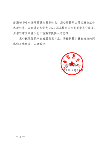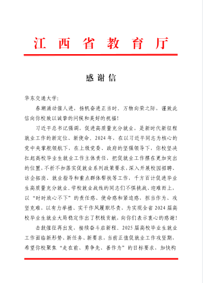 近日,省教育廳向我校發(fā)來感謝信,感謝我校就業(yè)戰(zhàn)線的同志們不懼挑戰(zhàn)、迎難而上,以“時時放心不下”的責(zé)任感、使命感和緊迫感,擔(dān)當(dāng)作為、攻堅克難,以有力舉措、實(shí)干作風(fēng)履職盡責(zé),為實(shí)現(xiàn)全省 2024 屆高校畢業(yè)生就業(yè)大局穩(wěn)定作出了積極貢獻(xiàn)。希望我校聚焦“走在前、勇爭先、善作為”的目標(biāo)要求,加快構(gòu)建高校畢業(yè)生高質(zhì)量就業(yè)服務(wù)體系,用心用情用力落實(shí)就業(yè)工作各項(xiàng)任務(wù),以奮進(jìn)姿態(tài)促進(jìn)2025屆高校畢業(yè)生高質(zhì)量充分就業(yè),為譜寫中國式現(xiàn)代化江西篇章提供人才支撐。