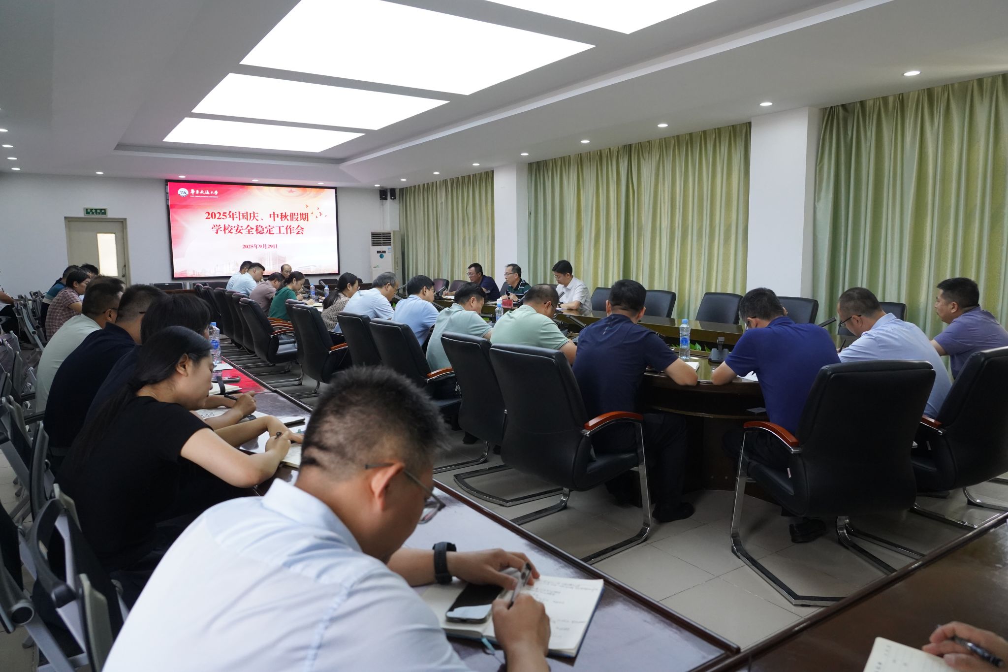 保衛(wèi)處、黨辦校辦、宣傳部、統(tǒng)戰(zhàn)部、學工部、研工部、資產(chǎn)處、基建處、國交處、后勤中心、網(wǎng)信中心、圖書館、華交產(chǎn)業(yè)集團、衛(wèi)健中心、附屬學校主要負責人,各學院黨委書記參加會議。(陳君 攝)