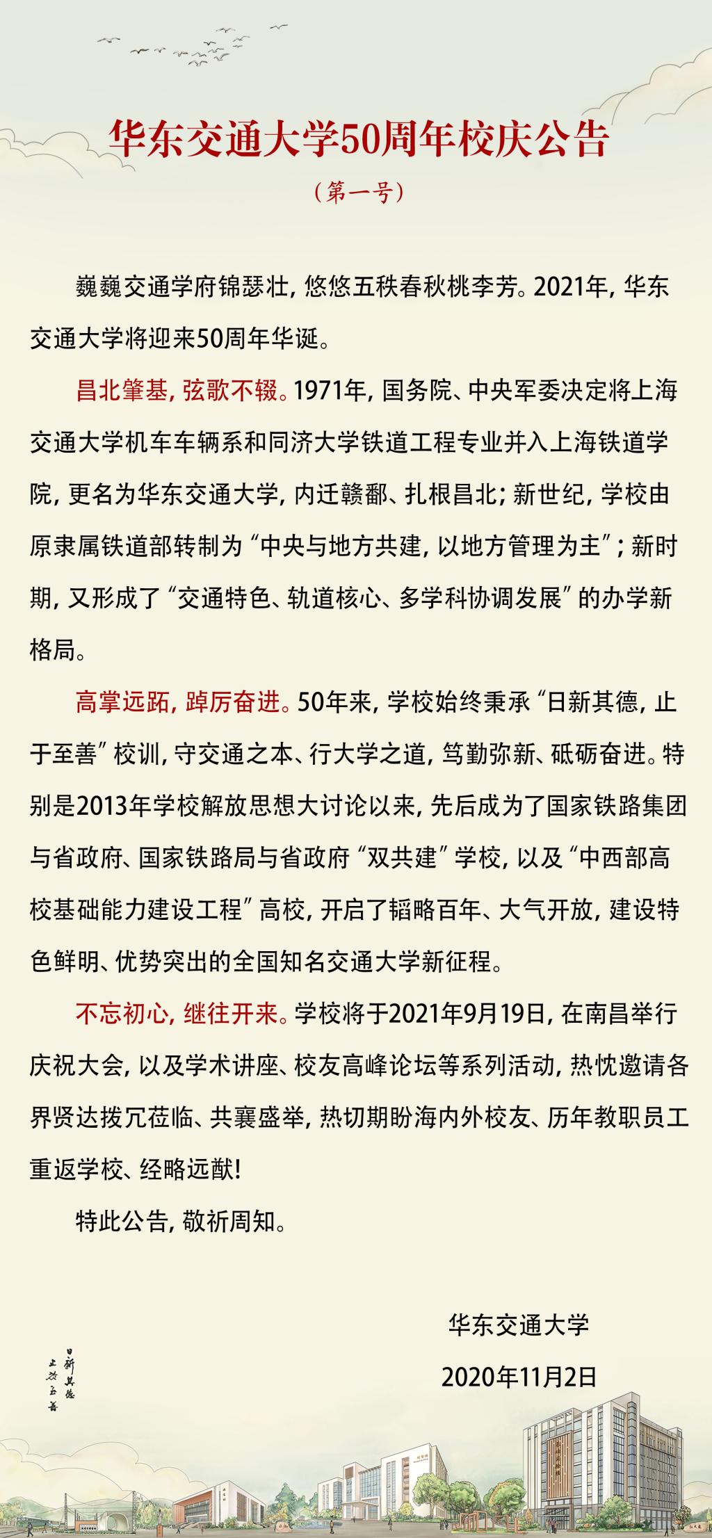 華東交通大學50周年校慶公告(第一號)