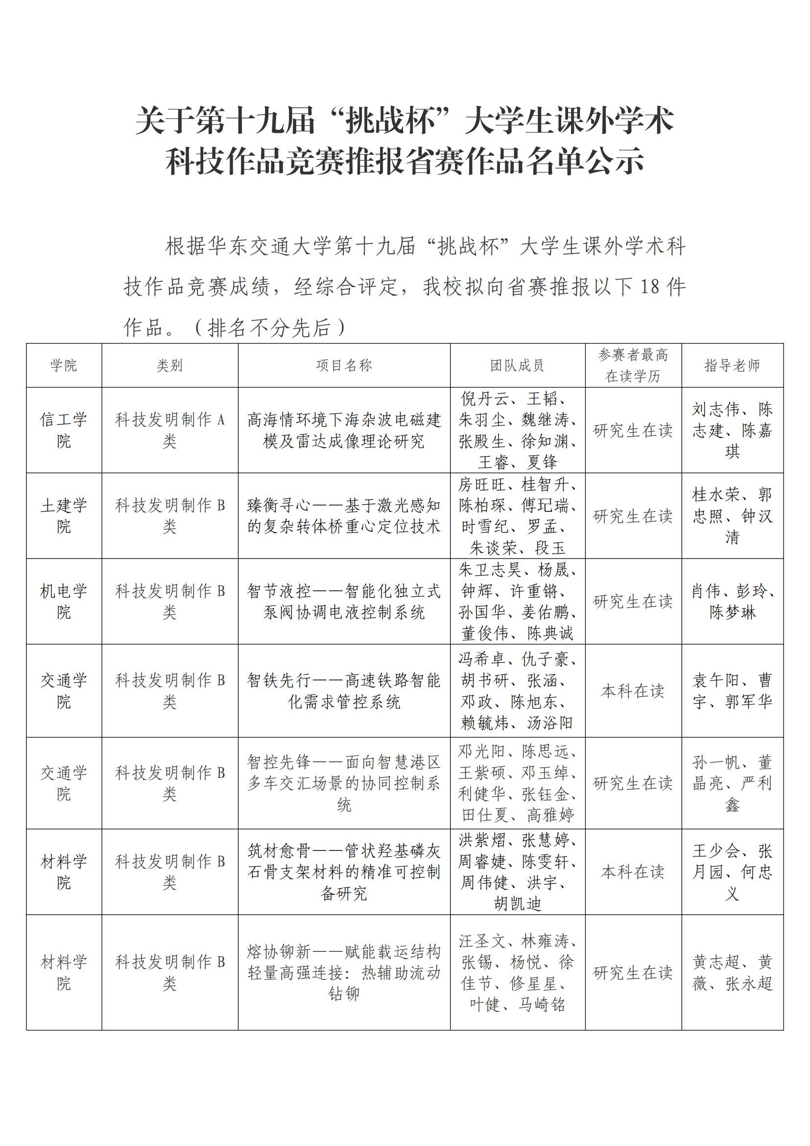 關于第十九屆“挑戰杯”大學生課外學術科技作品競賽推報省賽作品名單公示