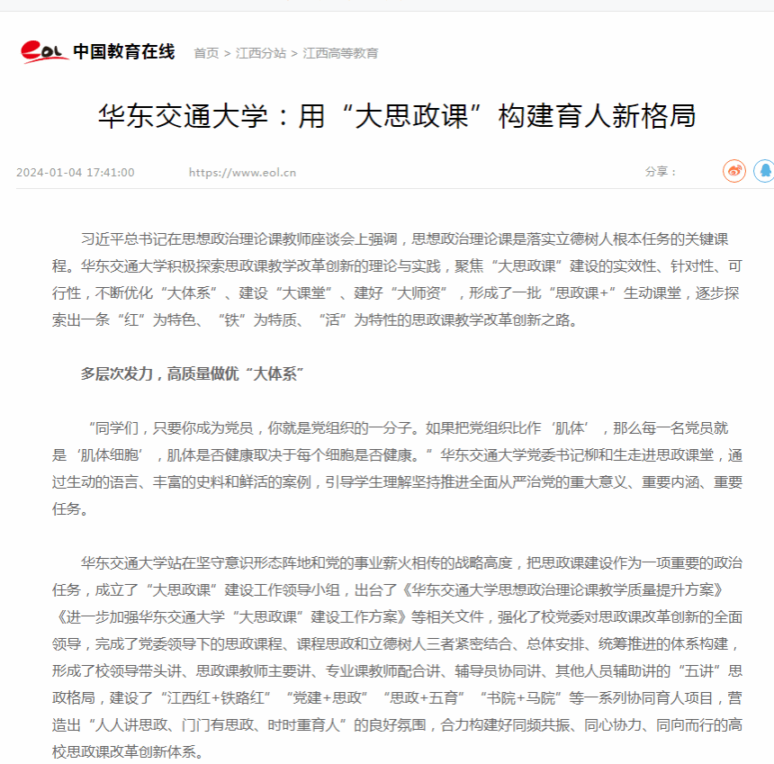 華東交通大學站在堅守意識形態陣地和黨的事業薪火相傳的戰略高度,把思政課建設作為一項重要的政治任務,成立了“大思政課”建設工作領導小組,出臺了《華東交通大學思想政治理論課教學質量提升方案》《進一步加強華東交通大學“大思政課”建設工作方案》等相關文件,強化了校黨委對思政課改革創新的全面領導,完成了黨委領導下的思政課程、課程思政和立德樹人三者緊密結合、總體安排、統籌推進的體系構建,形成了校領導帶頭講、思政課教師主要講、專業課教師配合講、輔導員協同講、其他人員輔助講的“五講”思政格局,建設了“江西紅+鐵路紅”“黨建+思政”“思政+五育”“書院+馬院”等一系列協同育人項目,營造出“人人講思政、門門有思政、時時重育人”的良好氛圍,合力構建好同頻共振、同心協力、同向而行的高校思政課改革創新體系。