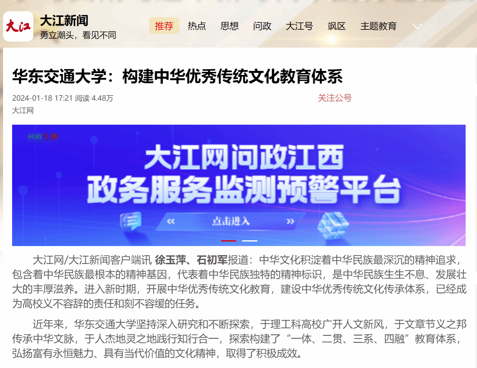 近年來,華東交通大學堅持深入研究和不斷探索,于理工科高校廣開人文新風,于文章節義之邦傳承中華文脈,于人杰地靈之地踐行知行合一,探索構建了“一體、二貫、三系、四融”教育體系,弘揚富有永恒魅力、具有當代價值的文化精神,取得了積極成效。