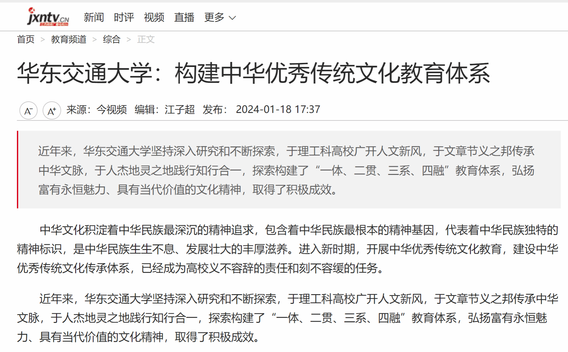 近年來,華東交通大學(xué)堅持深入研究和不斷探索,于理工科高校廣開人文新風(fēng),于文章節(jié)義之邦傳承中華文脈,于人杰地靈之地踐行知行合一,探索構(gòu)建了“一體、二貫、三系、四融”教育體系,弘揚富有永恒魅力、具有當(dāng)代價值的文化精神,取得了積極成效。