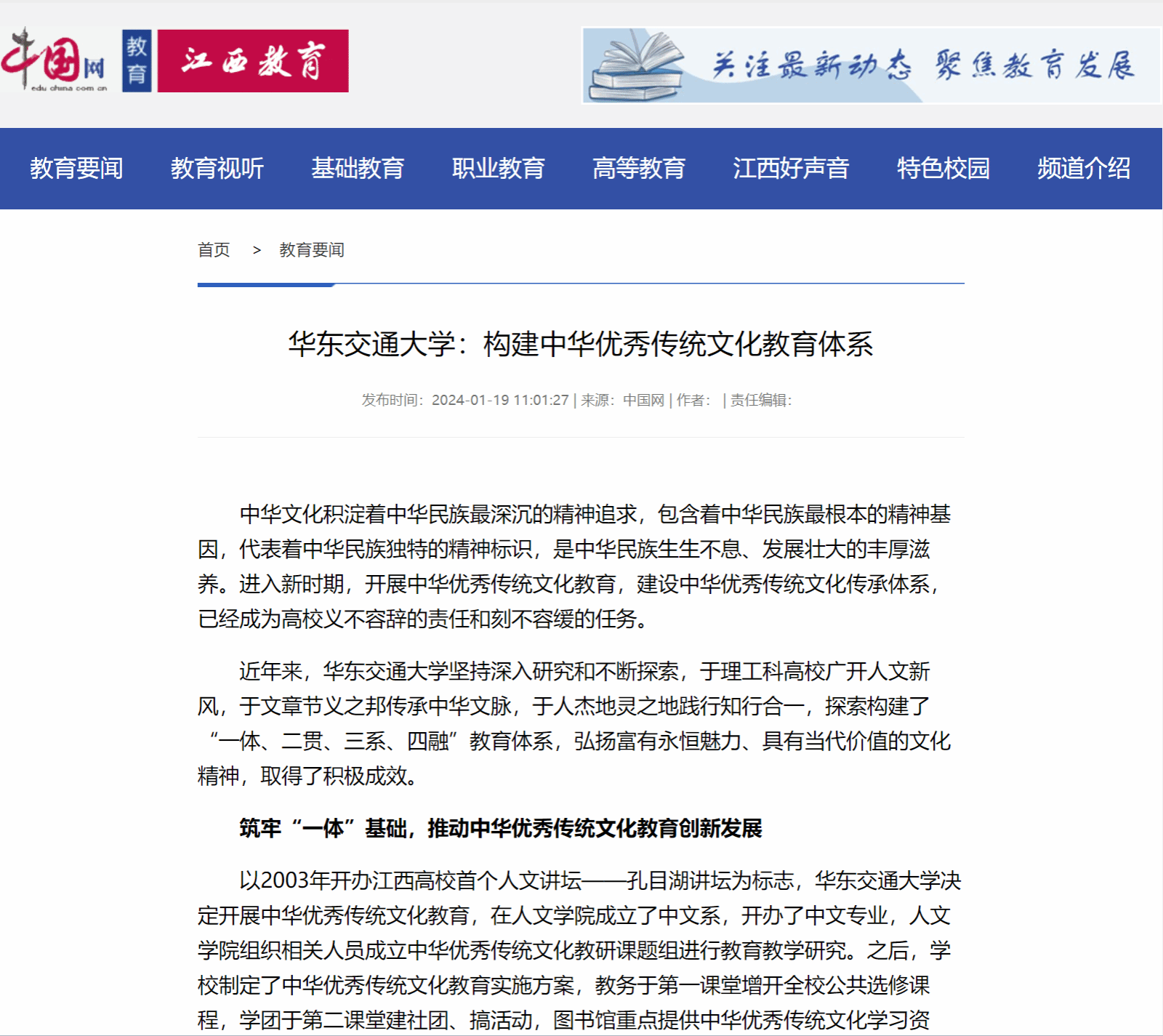 以2003年開辦江西高校首個人文講壇——孔目湖講壇為標志,華東交通大學決定開展中華優秀傳統文化教育,在人文學院成立了中文系,開辦了中文專業,人文學院組織相關人員成立中華優秀傳統文化教研課題組進行教育教學研究。之后,學校制定了中華優秀傳統文化教育實施方案,教務于第一課堂增開全校公共選修課程,學團于第二課堂建社團、搞活動,圖書館重點提供中華優秀傳統文化學習資源,且注重校內各部門之間的協同與配合,注重與校外相關組織機構的交流與合作,注重中華優秀傳統文化與思政、校園文化、紅色文化的結合,注重中華優秀傳統文化對中小學的影響。