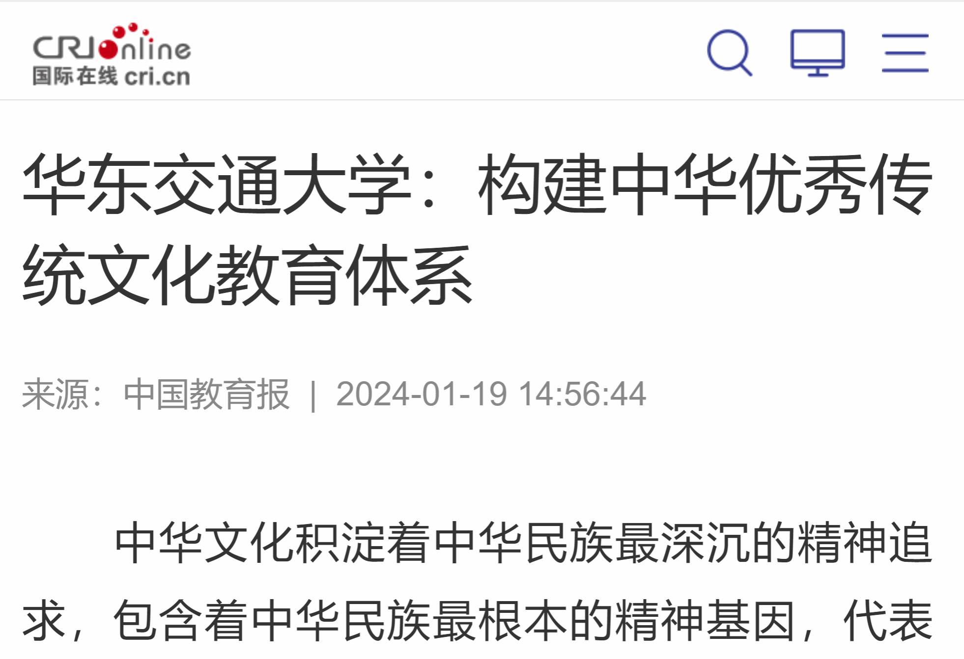 以2003年開辦江西高校首個人文講壇——孔目湖講壇為標志,華東交通大學決定開展中華優秀傳統文化教育,在人文學院成立了中文系,開辦了中文專業,人文學院組織相關人員成立中華優秀傳統文化教研課題組進行教育教學研究。之后,學校制定了中華優秀傳統文化教育實施方案,教務于第一課堂增開全校公共選修課程,學團于第二課堂建社團、搞活動,圖書館重點提供中華優秀傳統文化學習資源,且注重校內各部門之間的協同與配合,注重與校外相關組織機構的交流與合作,注重中華優秀傳統文化與思政、校園文化、紅色文化的結合,注重中華優秀傳統文化對中小學的影響。