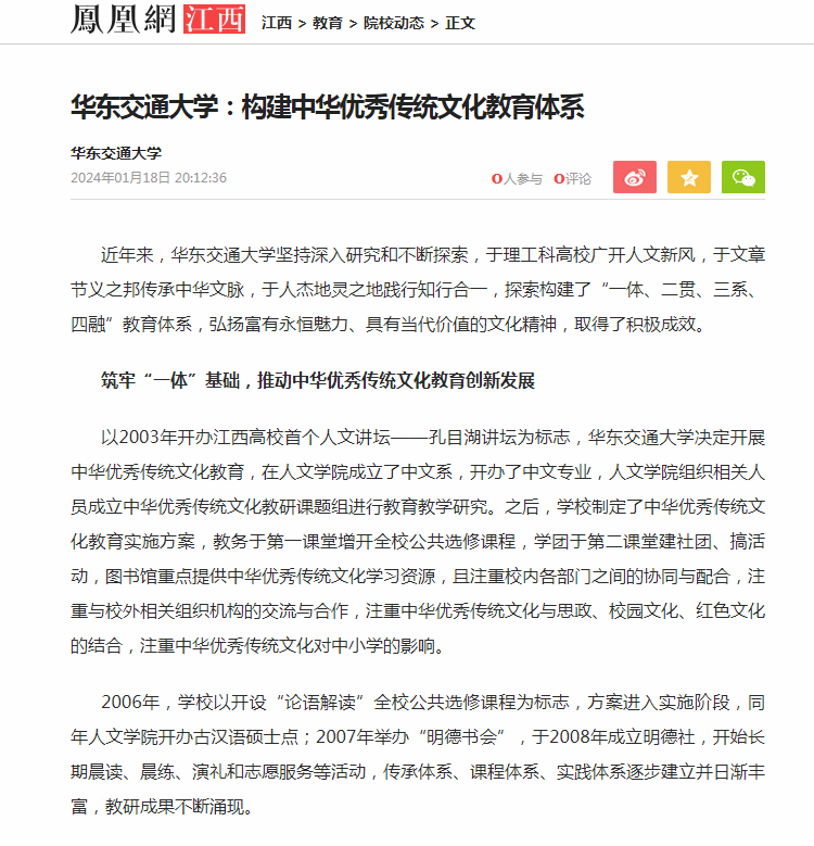 以2003年開辦江西高校首個人文講壇——孔目湖講壇為標志,華東交通大學決定開展中華優秀傳統文化教育,在人文學院成立了中文系,開辦了中文專業,人文學院組織相關人員成立中華優秀傳統文化教研課題組進行教育教學研究。之后,學校制定了中華優秀傳統文化教育實施方案,教務于第一課堂增開全校公共選修課程,學團于第二課堂建社團、搞活動,圖書館重點提供中華優秀傳統文化學習資源,且注重校內各部門之間的協同與配合,注重與校外相關組織機構的交流與合作,注重中華優秀傳統文化與思政、校園文化、紅色文化的結合,注重中華優秀傳統文化對中小學的影響。