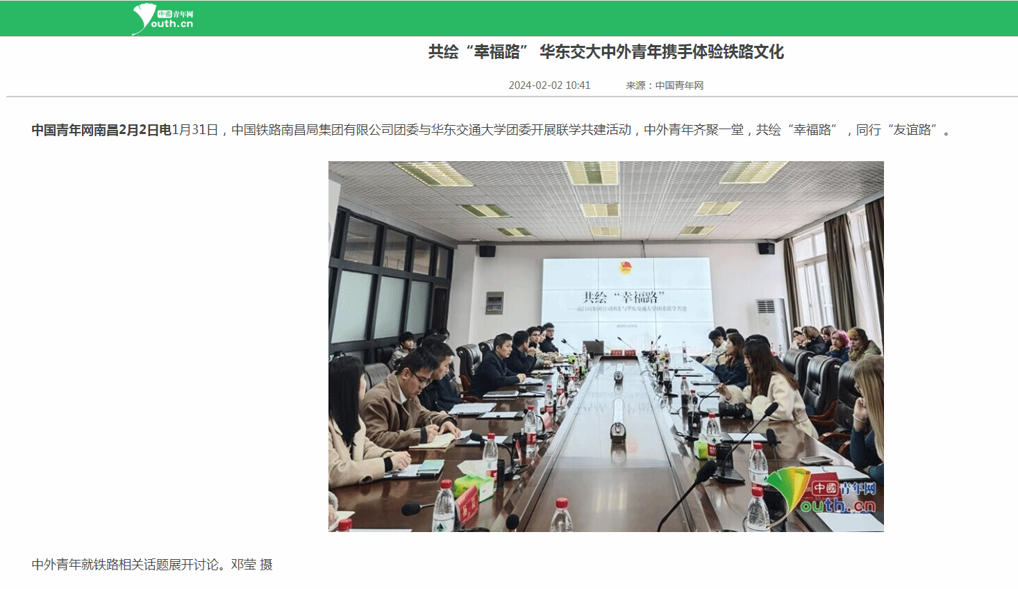 1月31日,中國(guó)鐵路南昌局集團(tuán)有限公司團(tuán)委與華東交通大學(xué)團(tuán)委開(kāi)展聯(lián)學(xué)共建活動(dòng),中外青年齊聚一堂,共繪“幸福路”,同行“友誼路”。