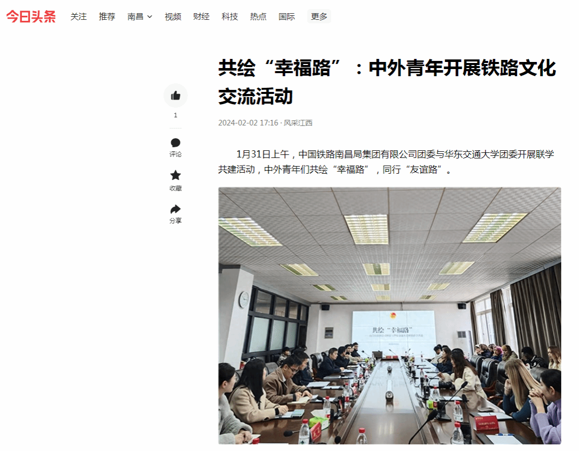 1月31日上午,中國鐵路南昌局集團有限公司團委與華東交通大學團委開展聯學共建活動,中外青年們共繪“幸福路”,同行“友誼路”。