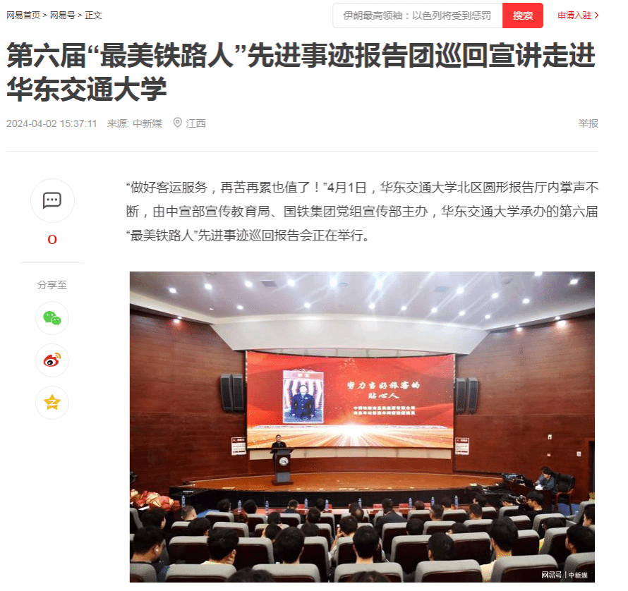 “做好客運(yùn)服務(wù),再苦再累也值了!”4月1日,華東交通大學(xué)北區(qū)圓形報(bào)告廳內(nèi)掌聲不斷,由中宣部宣傳教育局、國鐵集團(tuán)黨組宣傳部主辦,華東交通大學(xué)承辦的第六屆“最美鐵路人”先進(jìn)事跡巡回報(bào)告會(huì)正在舉行。