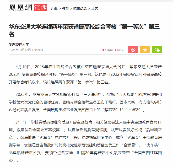 4月10日,2023年度江西省綜合考核總結暨通報表揚大會召開,華東交通大學榮獲2023年度省屬高校綜合考核“第一等次”第三名。這也是自2022年省委省政府對省屬高校開展綜合考核以來,該校連續兩年獲評“第一等次”第三名。