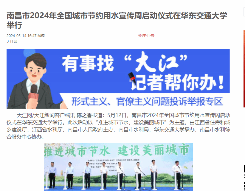 5月12日,南昌市2024年全國城市節約用水宣傳周啟動儀式在華東交通大學舉行。此次活動以“推進城市節水,建設美麗城市”為主題,由江西省住房和城鄉建設廳、江西省水利廳、南昌市人民政府主辦,南昌市水利局、華東交通大學承辦,南昌市水利綜合服務中心協辦。