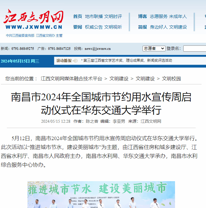 5月12日,南昌市2024年全國城市節(jié)約用水宣傳周啟動儀式在華東交通大學(xué)舉行。此次活動以“推進城市節(jié)水,建設(shè)美麗城市”為主題,由江西省住房和城鄉(xiāng)建設(shè)廳、江西省水利廳、南昌市人民政府主辦,南昌市水利局、華東交通大學(xué)承辦,南昌市水利綜合服務(wù)中心協(xié)辦。