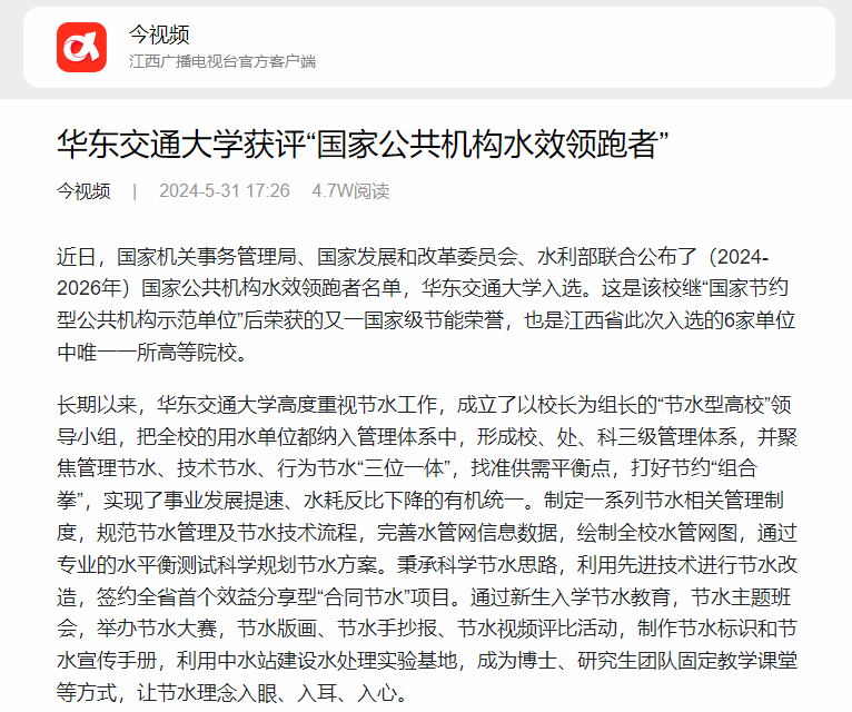 近日,國(guó)家機(jī)關(guān)事務(wù)管理局、國(guó)家發(fā)展和改革委員會(huì)、水利部聯(lián)合公布了(2024-2026年)國(guó)家公共機(jī)構(gòu)水效領(lǐng)跑者名單,華東交通大學(xué)入選。這是該校繼“國(guó)家節(jié)約型公共機(jī)構(gòu)示范單位”后榮獲的又一國(guó)家級(jí)節(jié)能榮譽(yù),也是江西省此次入選的6家單位中唯一一所高等院校。