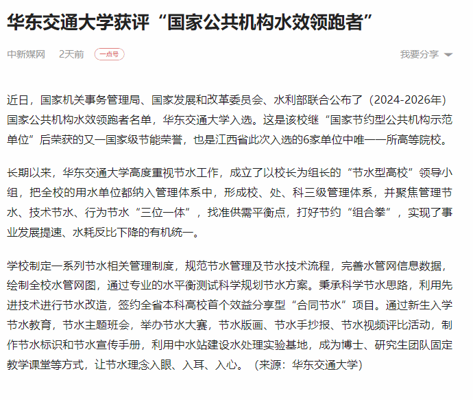 【一點資訊】華東交通大學獲評“國家公共機構水效領跑者”