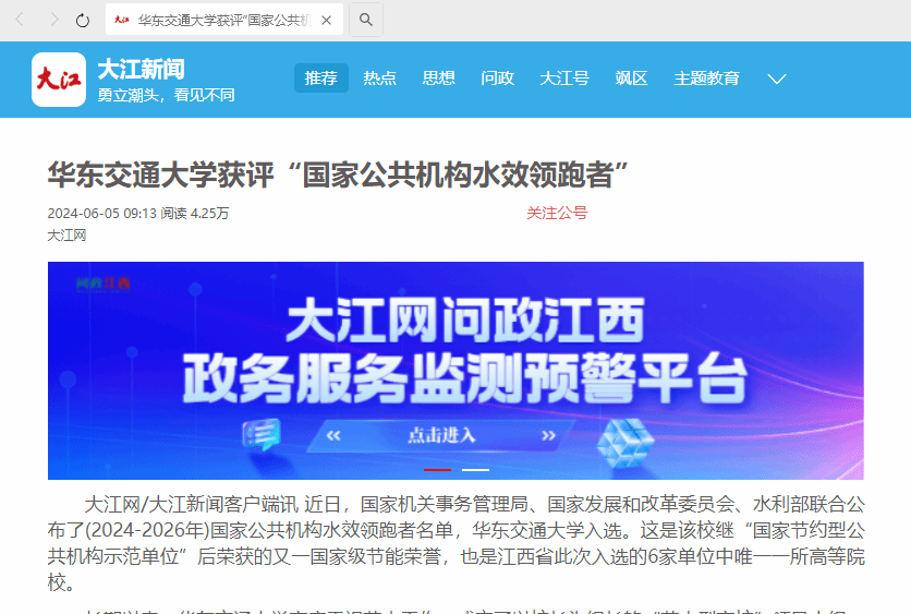 【大江新聞】華東交通大學獲評“國家公共機構水效領跑者”