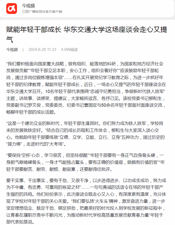“我們要積極面向國家重大戰略,做有組織、能落地的科研,為國家和地方經濟社會發展做貢獻”“年輕干部立足本職,安心工作,組織會看好你”“應該鼓勵年輕干部輪崗,通過多崗位鍛煉增強本領”……在扎實開展黨紀學習教育之際,為進一步抓好年輕干部的紀律教育,賦能年輕干部成長,近日,一場走心又提氣的年輕干部座談會在華東交通大學召開。10名年輕干部代表圍繞“忠誠守紀勇擔當,爭做新時代鐵人鐵軍”主題,講故事、談感受、提建議,大家暢所欲言、各抒己見。該校黨委書記柳和生,黨委副書記羅文俊,黨委委員、紀委書記曹國定與50余名年輕干部面對面座談交流,暢聊年輕干部的成長話題。