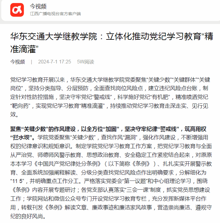 黨紀學習教育開展以來,華東交通大學繼教學院黨委聚焦“關鍵少數”“關鍵群體”“關鍵崗位”,堅持分類指導、分層預防,全面查找崗位風險點,建立違紀風險點臺賬,制定針對性防控措施,堅決守牢黨紀“警戒線”,科學施好黨紀“有機肥”,精準噴灑黨紀“靶向藥”,實現黨紀學習教育“精準滴灌”,持續推動黨紀學習教育走深走實、見行見效。