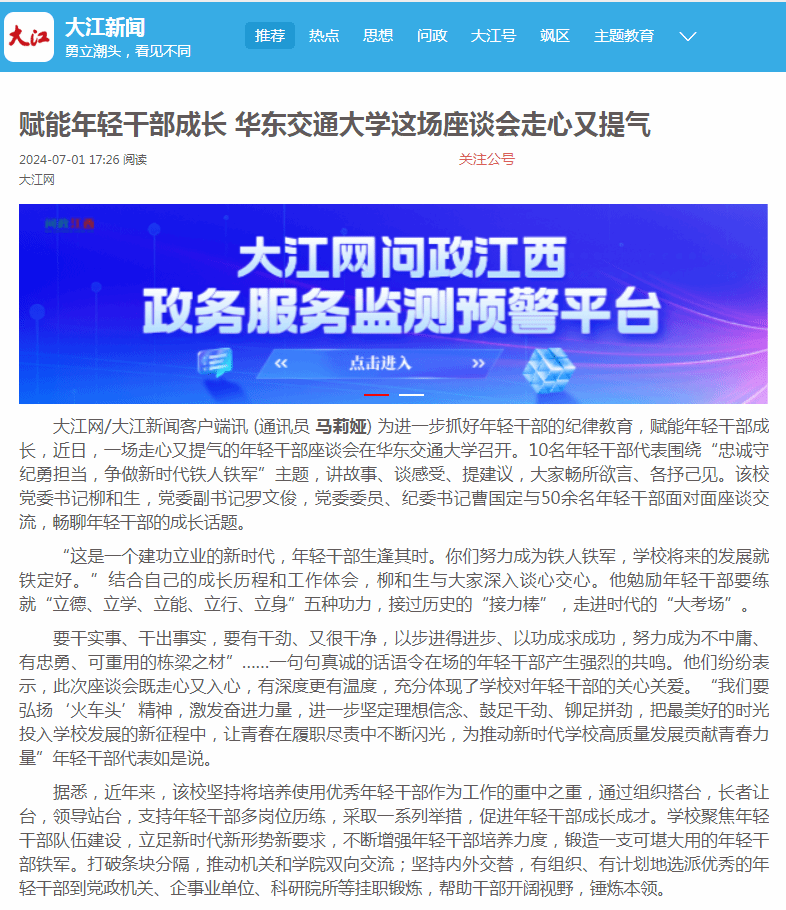 為進(jìn)一步抓好年輕干部的紀(jì)律教育,賦能年輕干部成長,近日,一場走心又提氣的年輕干部座談會在華東交通大學(xué)召開。10名年輕干部代表圍繞“忠誠守紀(jì)勇?lián)?dāng),爭做新時代鐵人鐵軍”主題,講故事、談感受、提建議,大家暢所欲言、各抒己見。該校黨委書記柳和生,黨委副書記羅文俊,黨委委員、紀(jì)委書記曹國定與50余名年輕干部面對面座談交流,暢聊年輕干部的成長話題。
