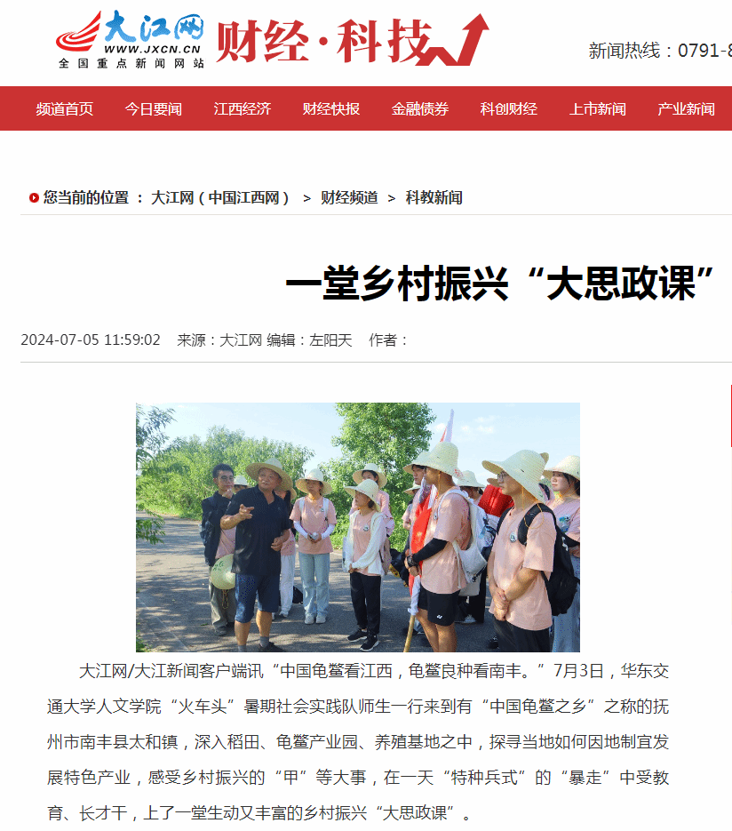 “中國龜鱉看江西,龜鱉良種看南豐?!?月3日,華東交通大學人文學院“火車頭”暑期社會實踐隊師生一行來到有“中國龜鱉之鄉”之稱的撫州市南豐縣太和鎮,深入稻田、龜鱉產業園、養殖基地之中,探尋當地如何因地制宜發展特色產業,感受鄉村振興的“甲”等大事,在一天“特種兵式”的“暴走”中受教育、長才干,上了一堂生動又豐富的鄉村振興“大思政課”。