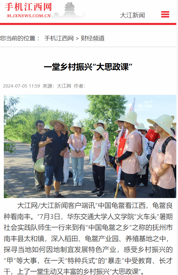 “中國龜鱉看江西,龜鱉良種看南豐。”7月3日,華東交通大學人文學院“火車頭”暑期社會實踐隊師生一行來到有“中國龜鱉之鄉”之稱的撫州市南豐縣太和鎮,深入稻田、龜鱉產業園、養殖基地之中,探尋當地如何因地制宜發展特色產業,感受鄉村振興的“甲”等大事,在一天“特種兵式”的“暴走”中受教育、長才干,上了一堂生動又豐富的鄉村振興“大思政課”。