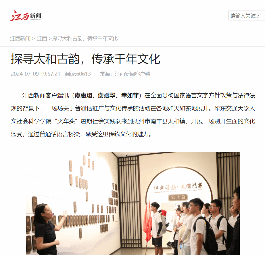 在全面貫徹國家語言文字方針政策與法律法規(guī)的背景下,一場場關(guān)于普通話推廣與文化傳承的活動在各地如火如荼地展開。華東交通大學人文社會科學學院“火車頭”暑期社會實踐隊來到撫州市南豐縣太和鎮(zhèn),開展一場別開生面的文化盛宴,通過普通話語言橋梁,感受這里傳統(tǒng)文化的魅力。