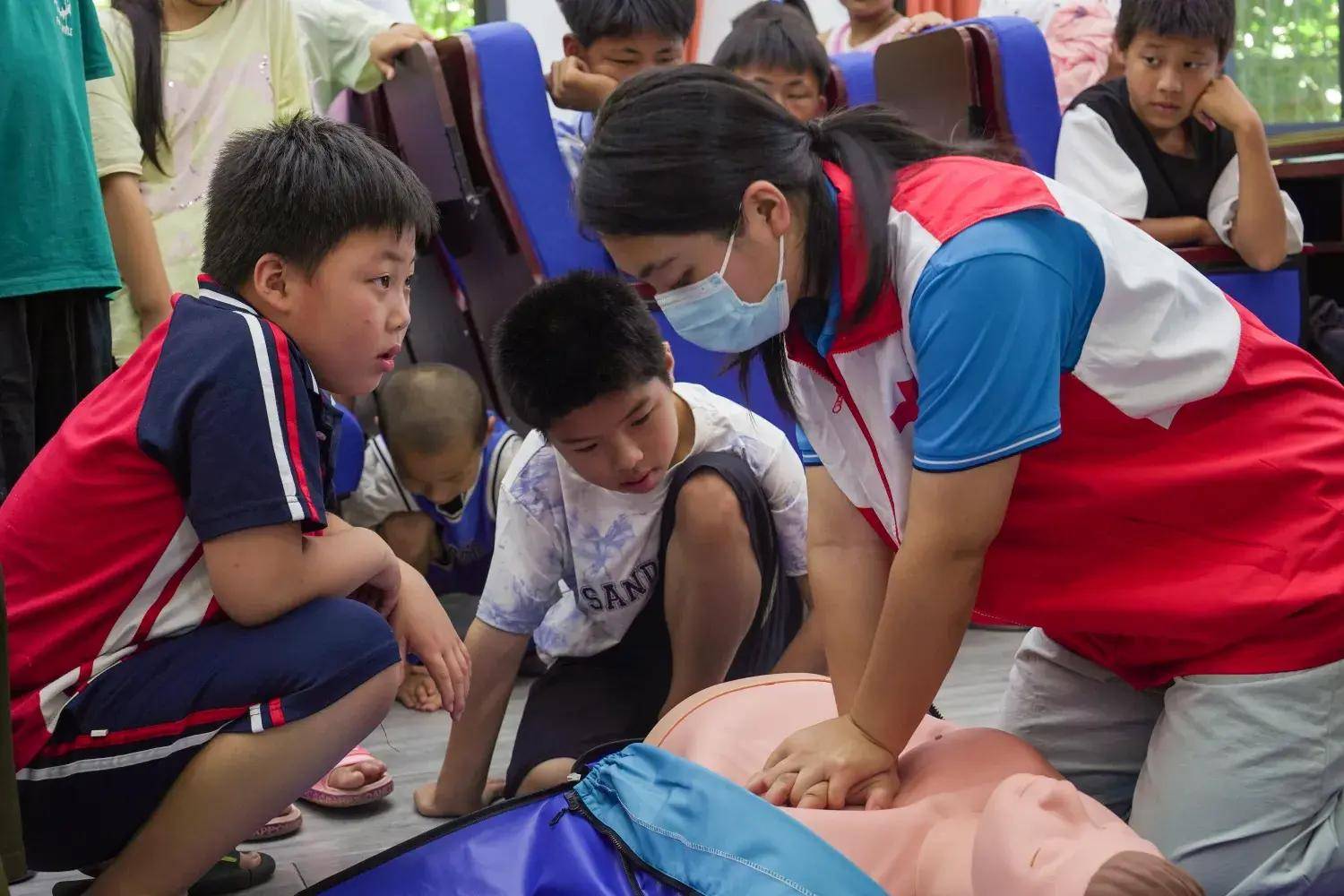 實踐團“紅十字隊”隊員們還為孩子們上了一堂繪聲繪色的“急救實踐課”。隊員們通過理論講解和實踐操作,為當?shù)氐暮⒆觽兤占傲诵姆螐吞K、創(chuàng)傷處理、止血包扎等急救技能,在他們的心中種下一顆“防災減災”的種子。