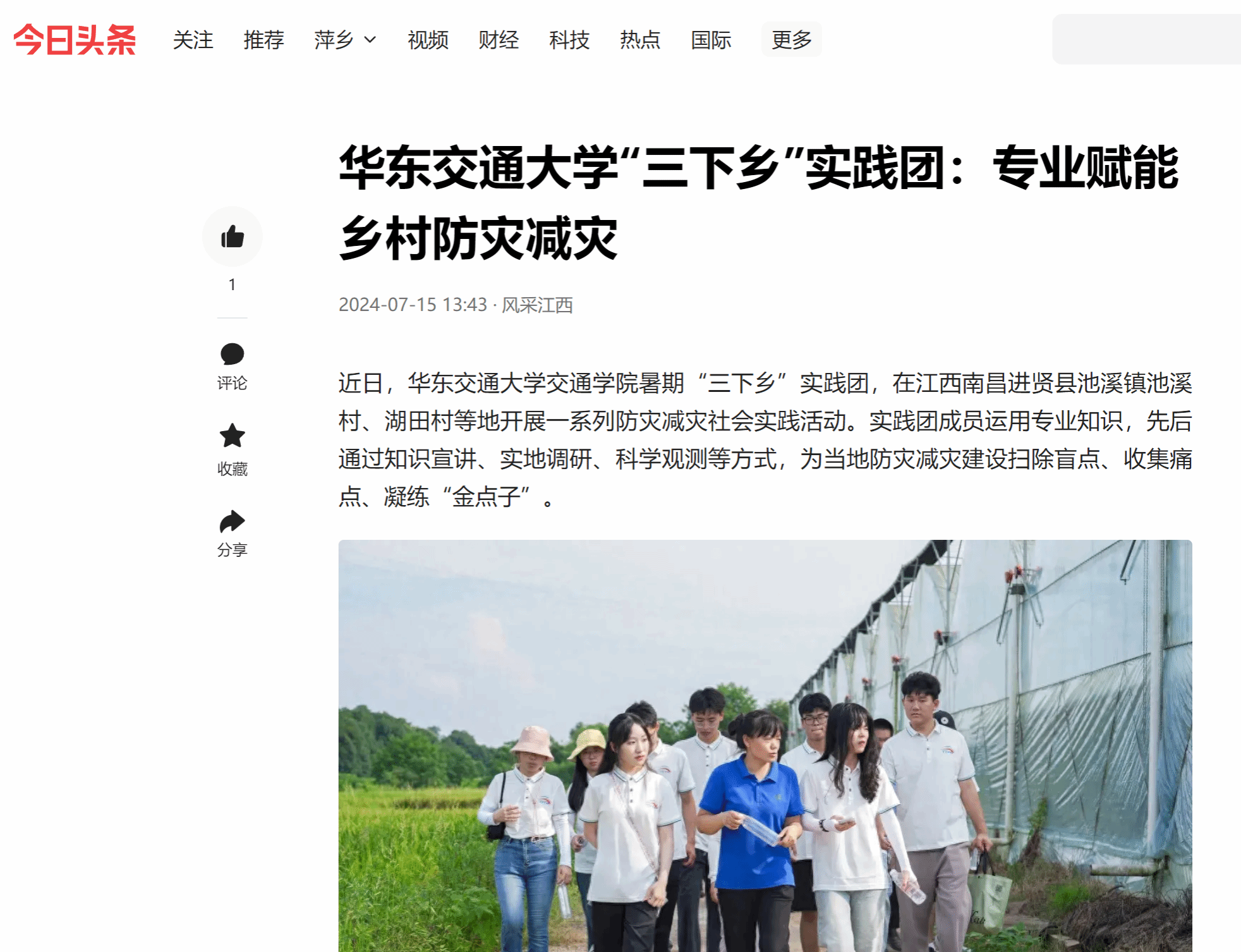 近日,華東交通大學交通學院暑期“三下鄉(xiāng)”實踐團,在江西南昌進賢縣池溪鎮(zhèn)池溪村、湖田村等地開展一系列防災減災社會實踐活動。實踐團成員運用專業(yè)知識,先后通過知識宣講、實地調(diào)研、科學觀測等方式,為當?shù)胤罏臏p災建設掃除盲點、收集痛點、凝練“金點子”。