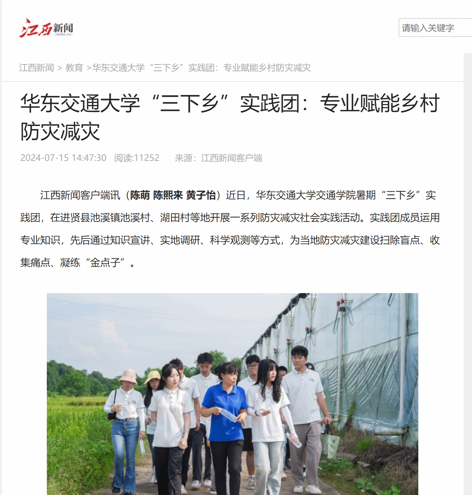 近日,華東交通大學交通學院暑期“三下鄉”實踐團,在進賢縣池溪鎮池溪村、湖田村等地開展一系列防災減災社會實踐活動。實踐團成員運用專業知識,先后通過知識宣講、實地調研、科學觀測等方式,為當地防災減災建設掃除盲點、收集痛點、凝練“金點子”。
