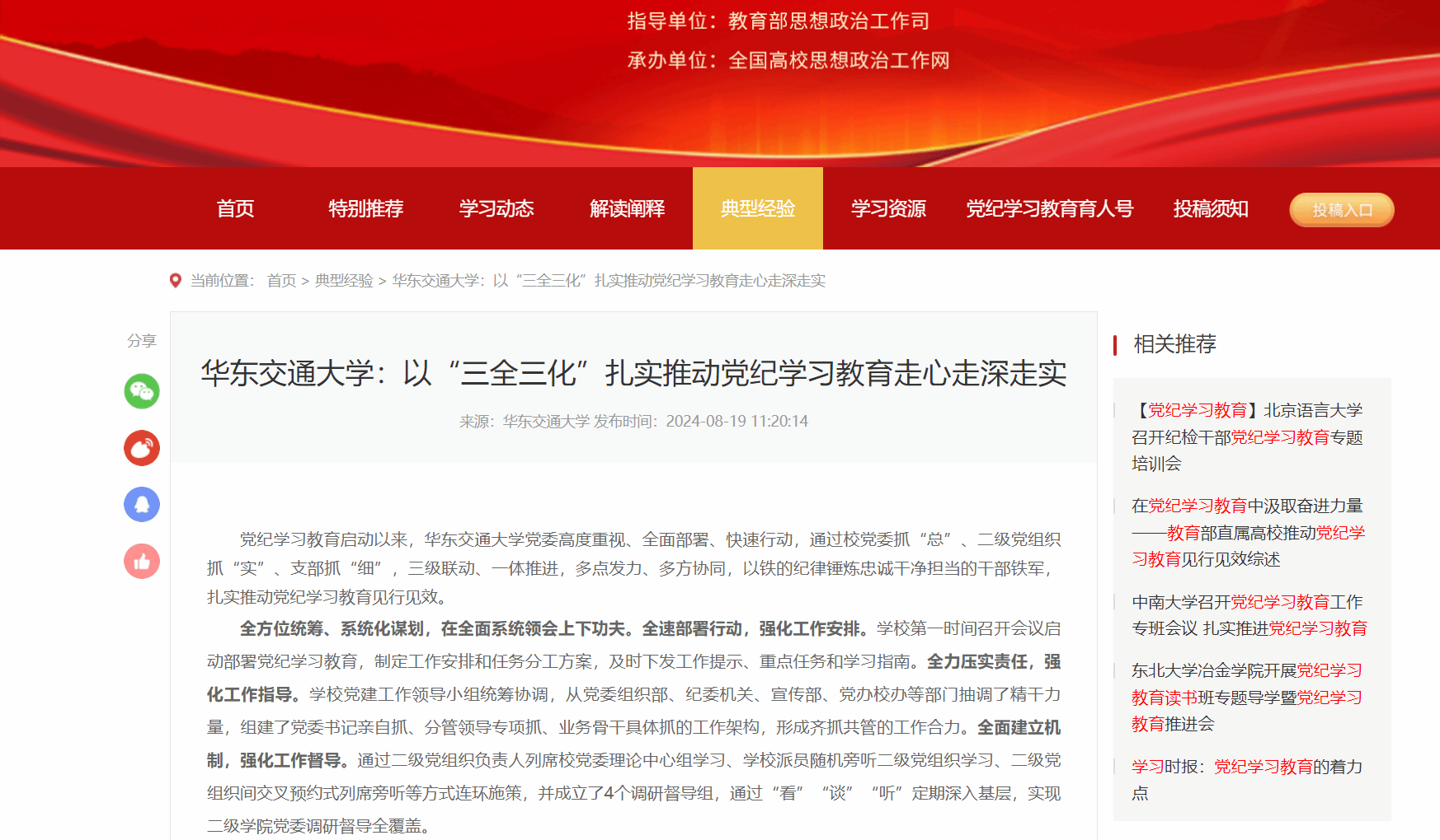 黨紀學習教育啟動以來,華東交通大學黨委高度重視、全面部署、快速行動,通過校黨委抓“總”、二級黨組織抓“實”、支部抓“細”,三級聯動、一體推進,多點發力、多方協同,以鐵的紀律錘煉忠誠干凈擔當的干部鐵軍,扎實推動黨紀學習教育見行見效。
