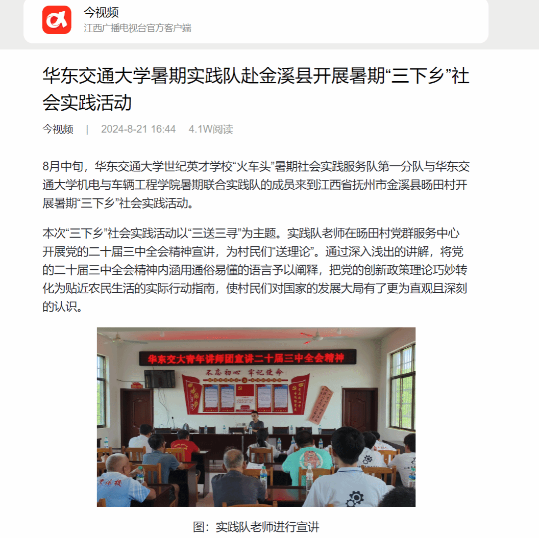 8月中旬,華東交通大學世紀英才學校“火車頭”暑期社會實踐服務隊第一分隊與華東交通大學機電與車輛工程學院暑期聯合實踐隊的成員來到江西省撫州市金溪縣旸田村開展暑期“三下鄉”社會實踐活動。