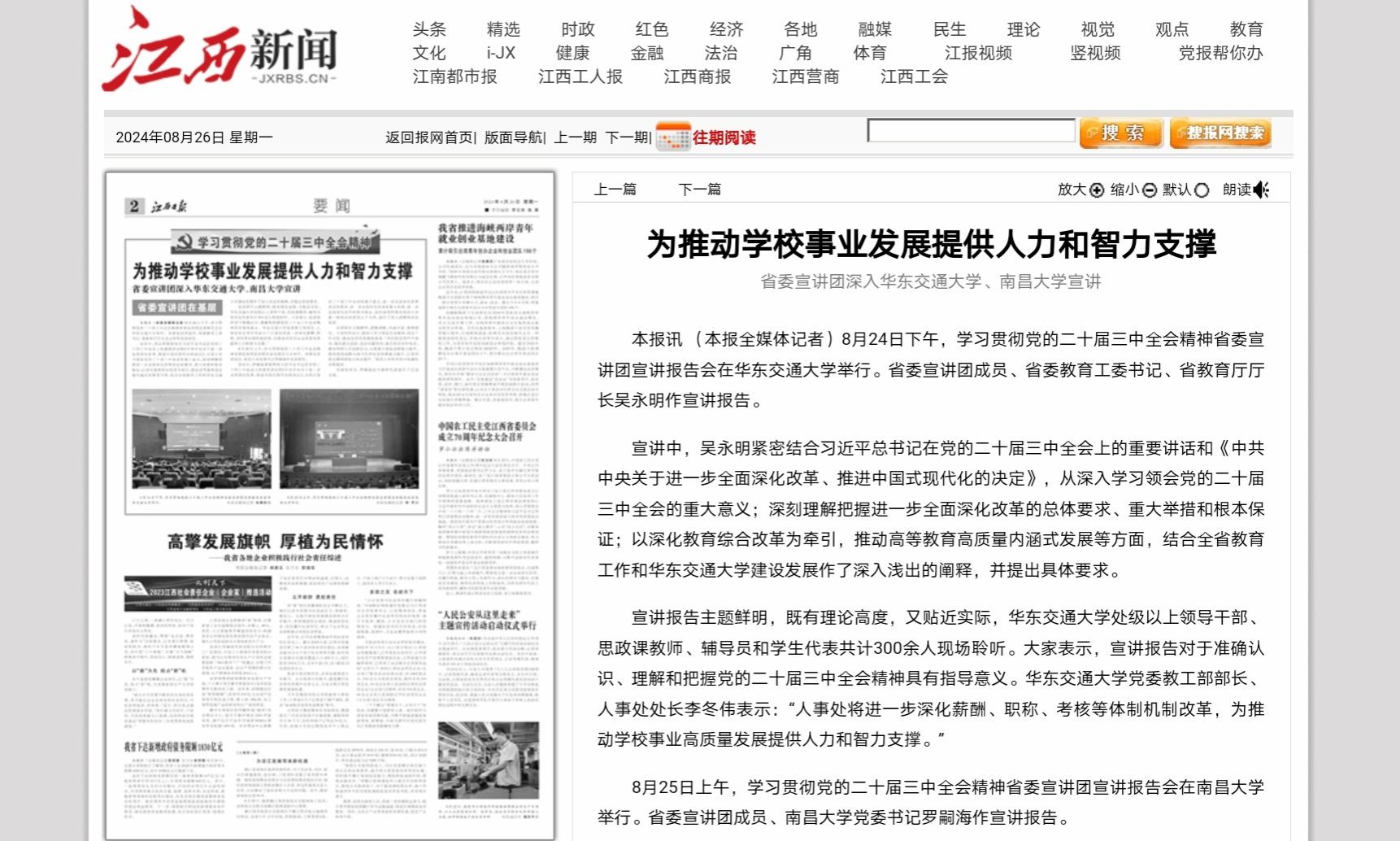 本報訊 (本報全媒體記者)8月24日下午,學習貫徹黨的二十屆三中全會精神省委宣講團宣講報告會在華東交通大學舉行。省委宣講團成員、省委教育工委書記、省教育廳廳長吳永明作宣講報告。