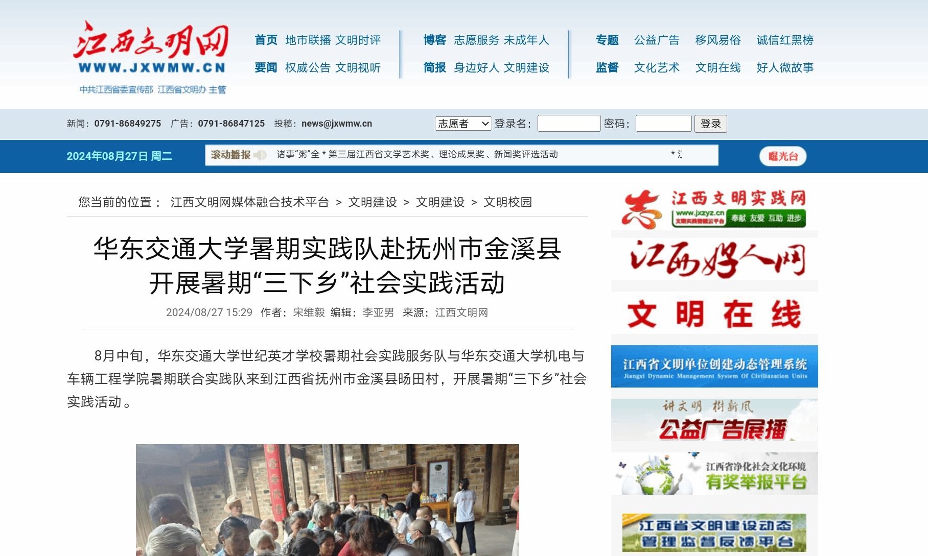 8月中旬,華東交通大學(xué)世紀(jì)英才學(xué)校暑期社會(huì)實(shí)踐服務(wù)隊(duì)與華東交通大學(xué)機(jī)電與車輛工程學(xué)院暑期聯(lián)合實(shí)踐隊(duì)來到江西省撫州市金溪縣旸田村,開展暑期“三下鄉(xiāng)”社會(huì)實(shí)踐活動(dòng)。