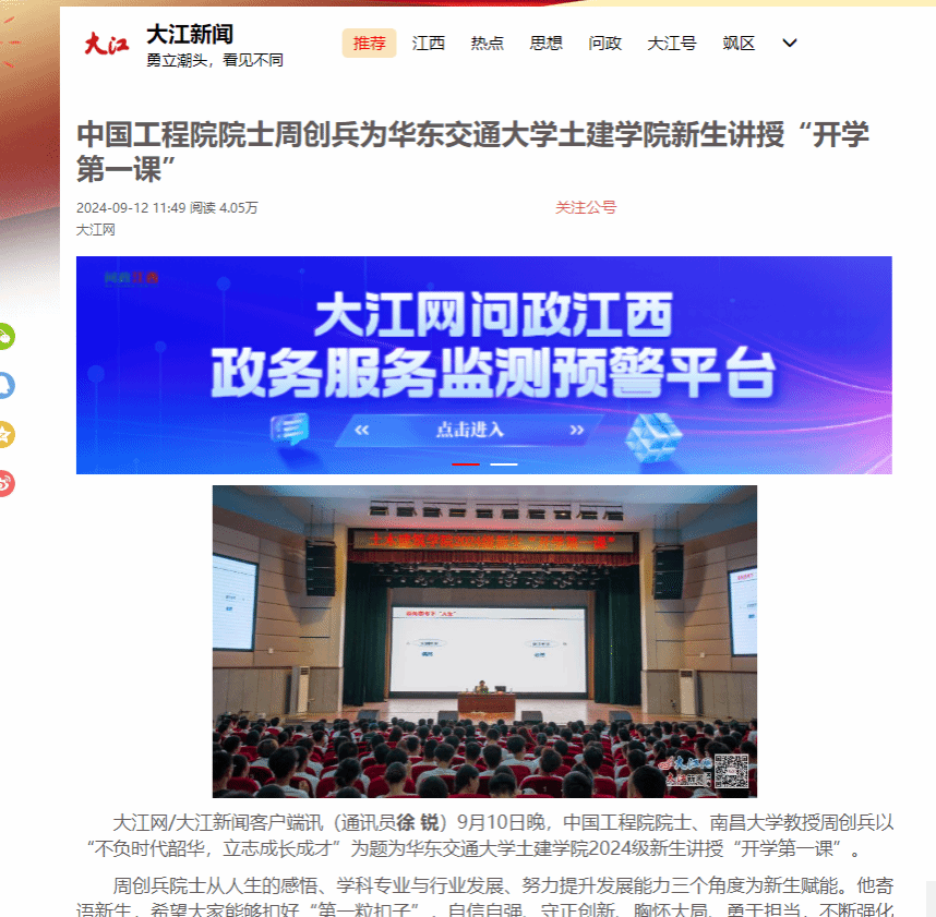 【大江新聞】中國工程院院士周創(chuàng)兵為華東交通大學(xué)新生講授“開學(xué)第一課”