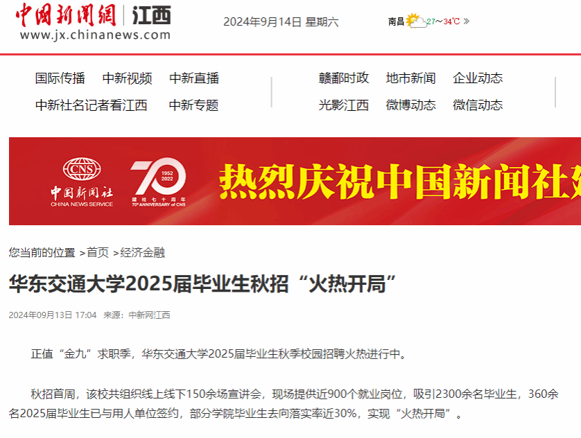 正值“金九”求職季,華東交通大學(xué)2025屆畢業(yè)生秋季校園招聘火熱進(jìn)行中。