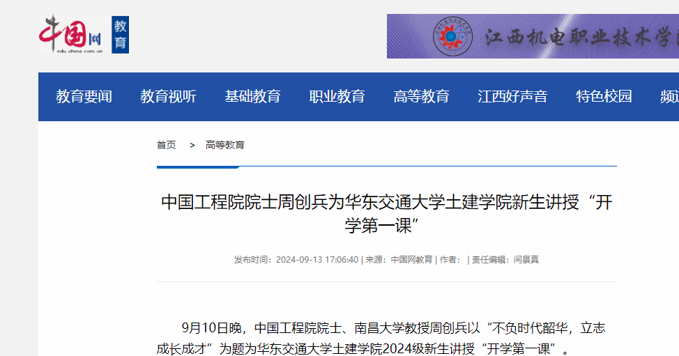 9月10日晚,中國工程院院士、南昌大學(xué)教授周創(chuàng)兵以“不負(fù)時(shí)代韶華,立志成長成才”為題為華東交通大學(xué)土建學(xué)院2024級新生講授“開學(xué)第一課”。