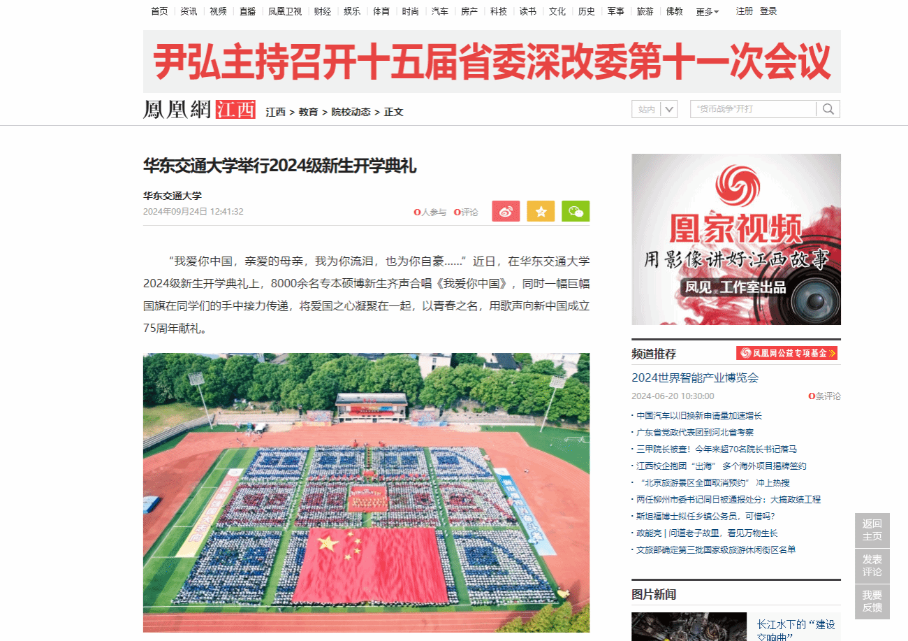 “我愛你中國,親愛的母親,我為你流淚,也為你自豪……”近日,在華東交通大學(xué)2024級新生開學(xué)典禮上,8000余名專本碩博新生齊聲合唱《我愛你中國》,同時一幅巨幅國旗在同學(xué)們的手中接力傳遞,將愛國之心凝聚在一起,以青春之名,用歌聲向新中國成立75周年獻(xiàn)禮。