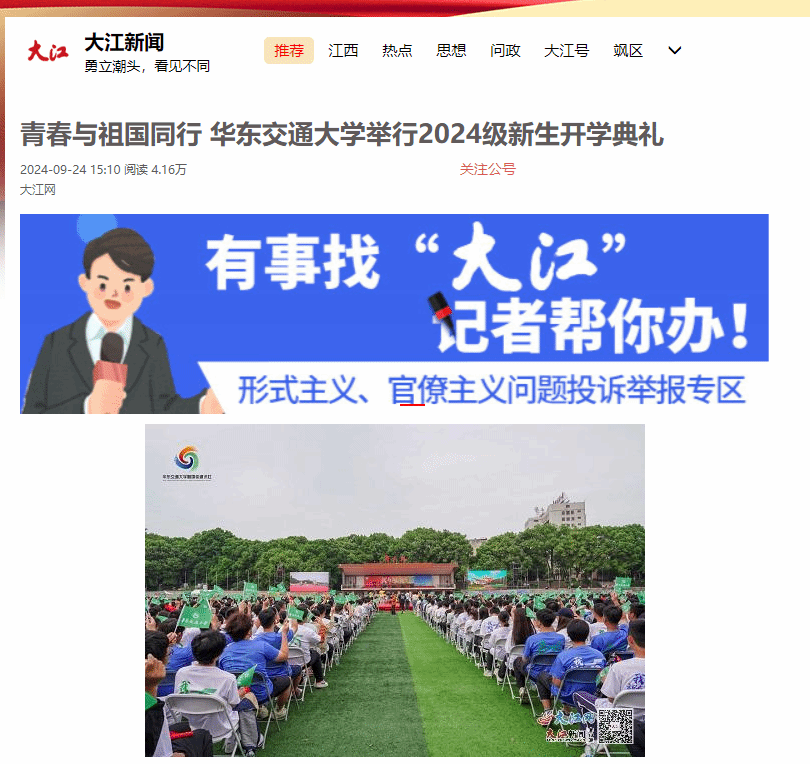 近日,在華東交通大學2024級新生開學典禮上,8000余名專本碩博新生齊聲合唱《我愛你中國》,同時一幅巨幅國旗在同學們的手中接力傳遞,將愛國之心凝聚在一起,以青春之名,用歌聲慶祝新中國成立75周年。