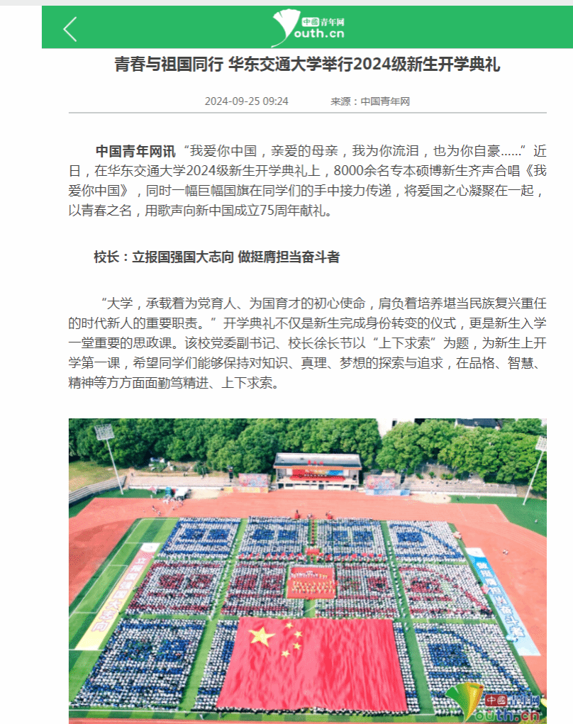“我愛(ài)你中國(guó),親愛(ài)的母親,我為你流淚,也為你自豪……”近日,在華東交通大學(xué)2024級(jí)新生開(kāi)學(xué)典禮上,8000余名專(zhuān)本碩博新生齊聲合唱《我愛(ài)你中國(guó)》,同時(shí)一幅巨幅國(guó)旗在同學(xué)們的手中接力傳遞,將愛(ài)國(guó)之心凝聚在一起,以青春之名,用歌聲向新中國(guó)成立75周年獻(xiàn)禮。