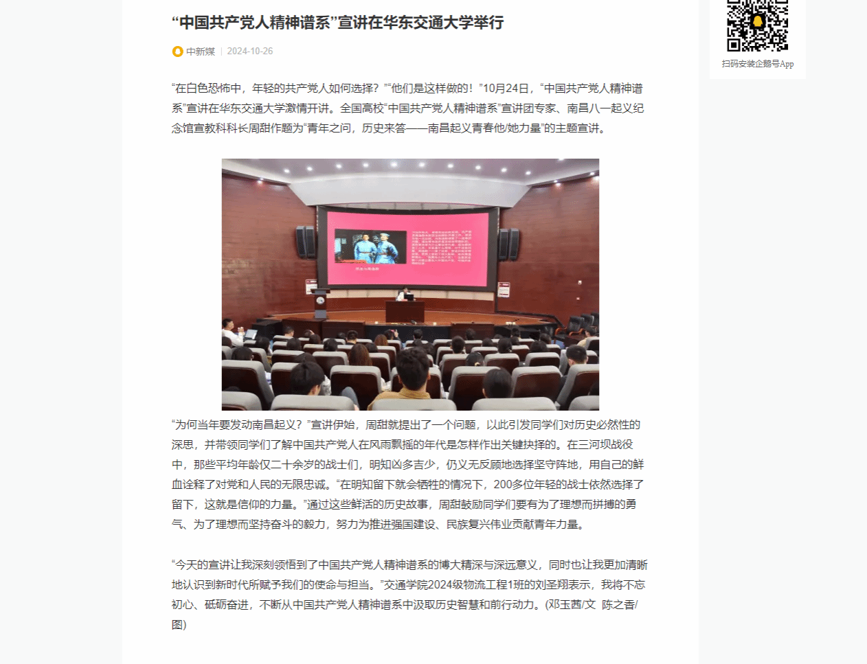 “在白色恐怖中,年輕的共產(chǎn)黨人如何選擇?”“他們是這樣做的!”10月24日,“中國(guó)共產(chǎn)黨人精神譜系”宣講在華東交通大學(xué)激情開講。全國(guó)高校“中國(guó)共產(chǎn)黨人精神譜系”宣講團(tuán)專家、南昌八一起義紀(jì)念館宣教科科長(zhǎng)周甜作題為“青年之問,歷史來答——南昌起義青春他/她力量”的主題宣講。